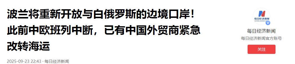 2025-09-23 22:43·每日经济新闻 波兰将重新开放与白俄罗斯的边境口岸!此前中欧班列中断,已有中国外贸商紧急改转海运